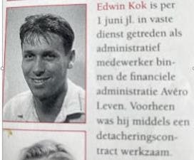 In het eerste gesprek op de afdeling werd mij ook meteen even duidelijk aangegeven: “Je zult hier nooit vast in dienst komen!” Nu 27 jaar later weet ik wel beter. Maar goed, na een uitzendperiode van 1 jaar en een detachering van 1 jaar, was op 1 juni 1997 de dag aangebroken dat ik in vaste dienst kwam van Avéro (AVCB Diensten B.V.). Het contract, in guldens, had nog wel het voorbehoud van “behoudens medische goedkeuring”. Wat natuurlijk aangeeft dat we binnen Avéro wel degelijk topsport bedrijven! Ik begon in de functie van: administratief medewerker bestanddesk van Avéro Leven/Hypotheken. Daarbij hoorde ook een publicatie in “De Koerier”. Het personeelsblad voor de medewerkers van Avéro: